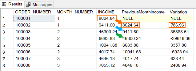 PreviousMonthIncome : Pour la première ligne, il n’existe pas de ligne précédente d’où la valeur par défaut NULL. Vous pouvez néanmoins personnaliser cette valeur par défaut en utilisant le paramètre VALEUR_PAR_DEFAUT de la fonction.  Pour la seconde ligne, on obtient 8624,64 qui est le revenu de la première ligne (ligne précédente) ; ainsi de suite.
