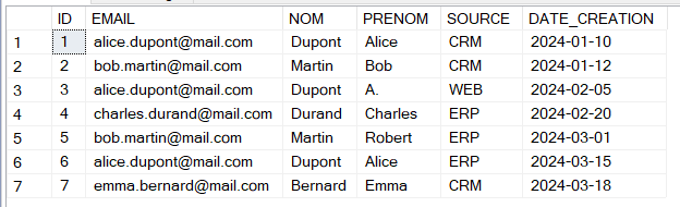 La clé métier étant l’adresse email, nous pouvons voir qu’il existe des doublons dans cette table.