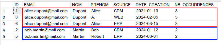 On obtient toutes les lignes en doublon, avec leurs valeurs complètes, leur ordre de création et une vision immédiate des différences entre les lignes (nom, date, source, etc.). Ceci est idéal pour analyser la qualité de données et debugger.