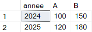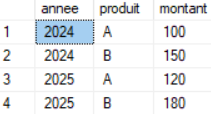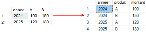 SELECT annee, produit, montant FROM ventes_pivot UNPIVOT ( montant FOR produit IN ([A], [B]) ) AS u;