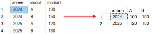 SELECT annee, SUM(CASE WHEN produit = 'A' THEN montant END) AS A, SUM(CASE WHEN produit = 'B' THEN montant END) AS B FROM ventes GROUP BY annee ORDER BY annee;